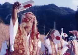 神楽が中盤を過ぎる頃―眠気と焼酎の匂い、中庭から屋内へと流れ込んでくる焚き火の煙、繰り返される神楽のリズムなどが相俟って、観客は陶然と酔い、夢と現の境を逍遥する。この時、荒々しい表情や滑稽な仕草、性的な演技などを演じる仮面神が登場すると、人々は、そこに神の降臨を見るのである。仮面は、まさに人が神に変身する装置なのである。